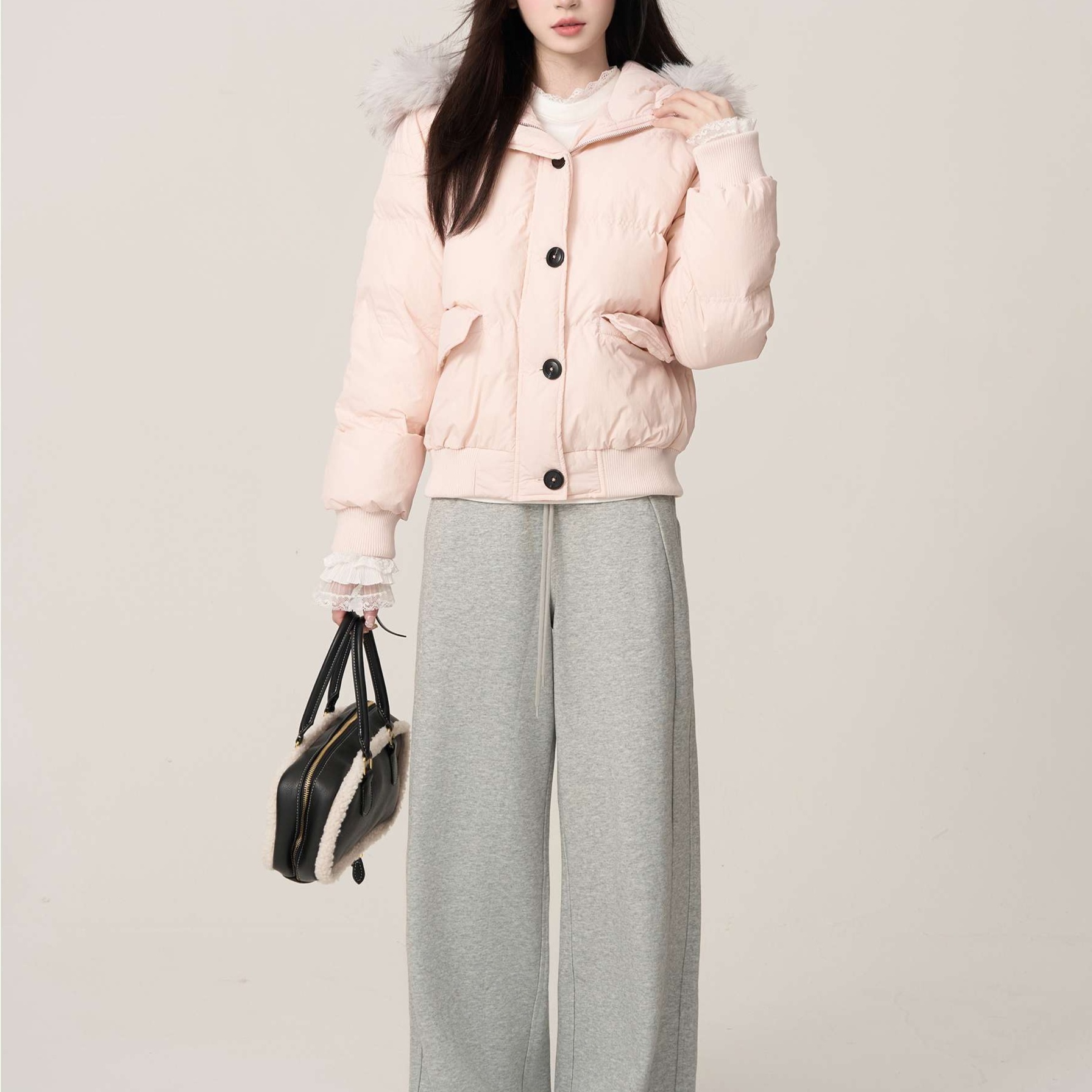 首元を優しく包む上質な白いファーが、全体の雰囲気を柔らかく演出し、デート向きの華やかさを演出します。