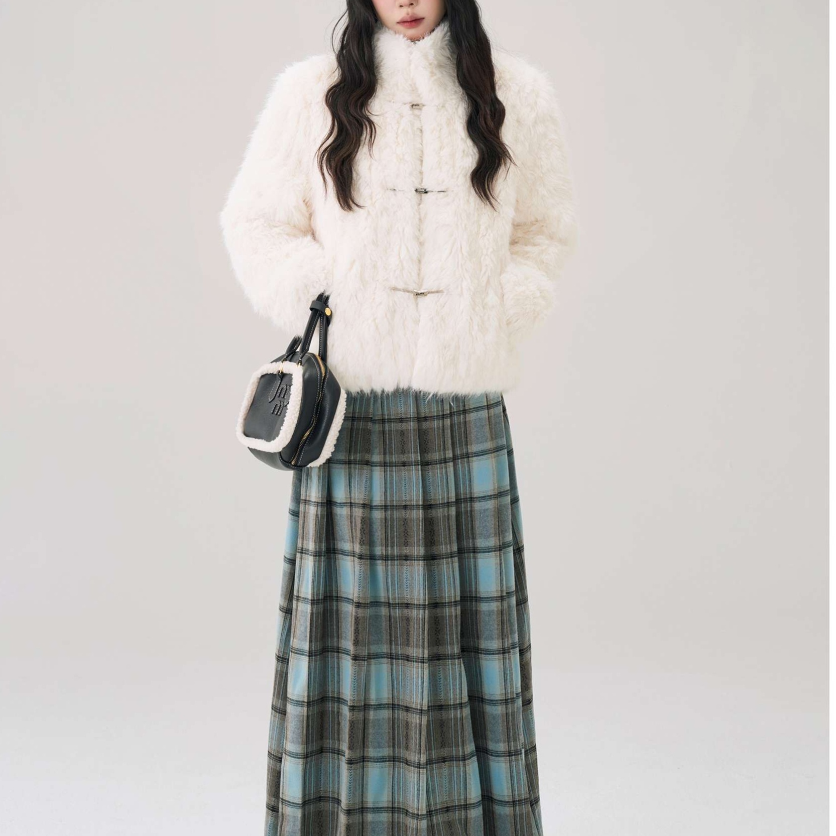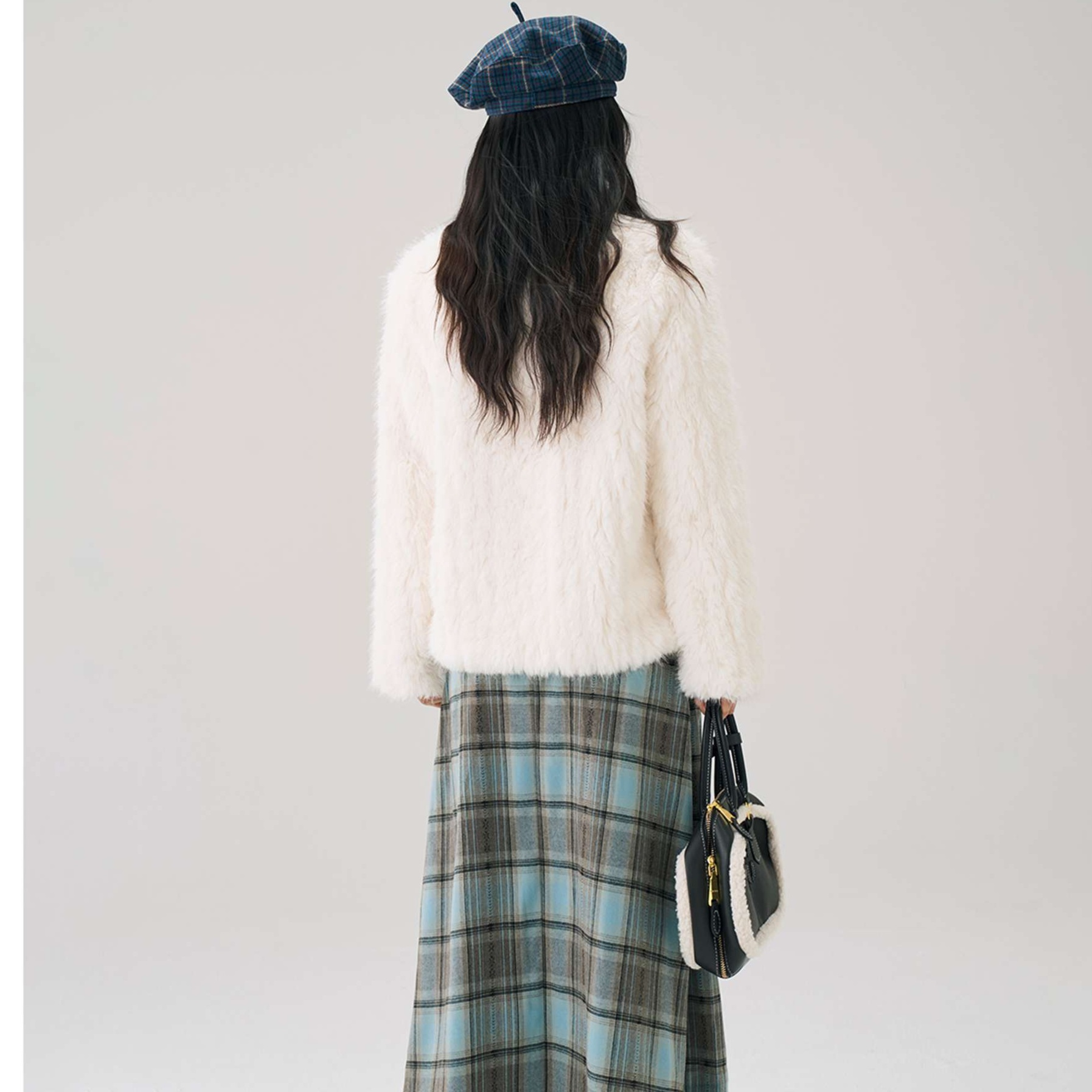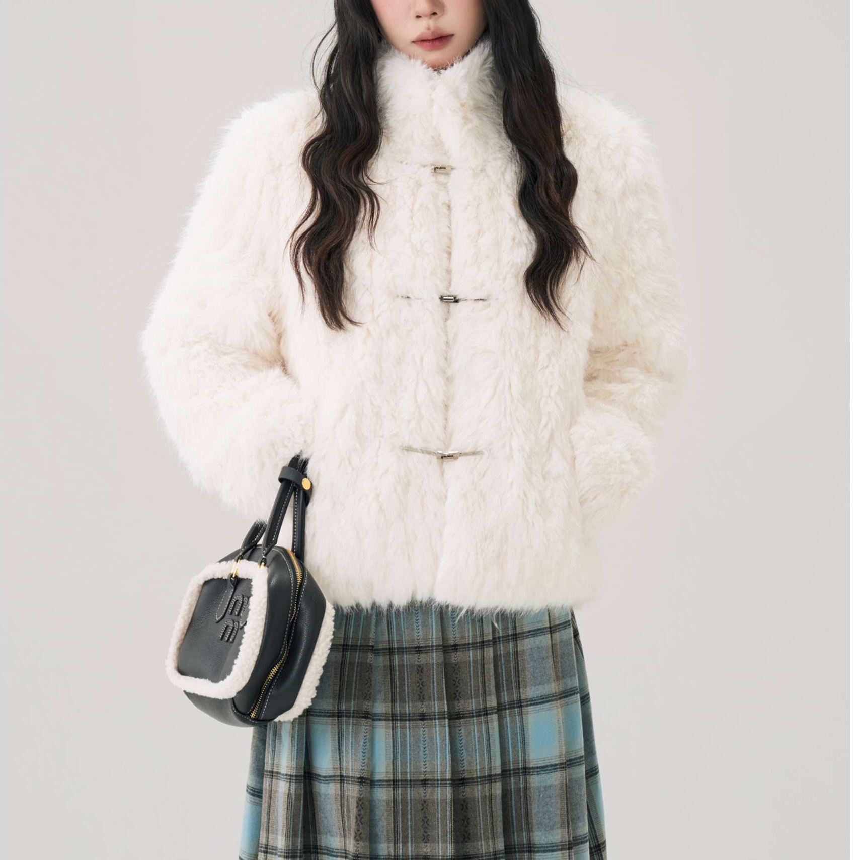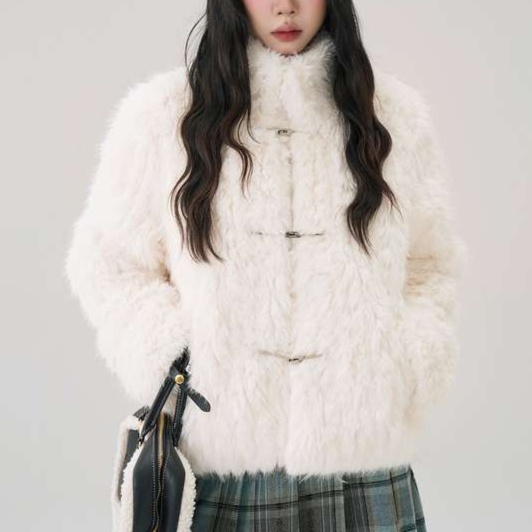冬のデートに映える柔らかなシャギー素材のショートコート。