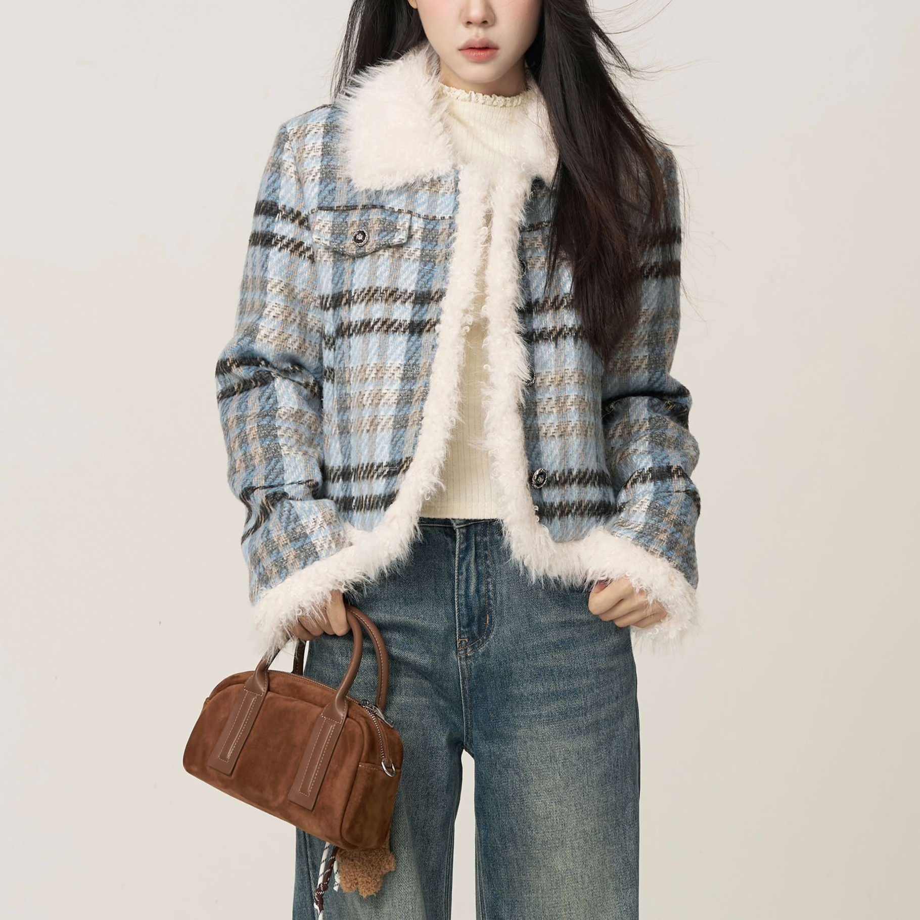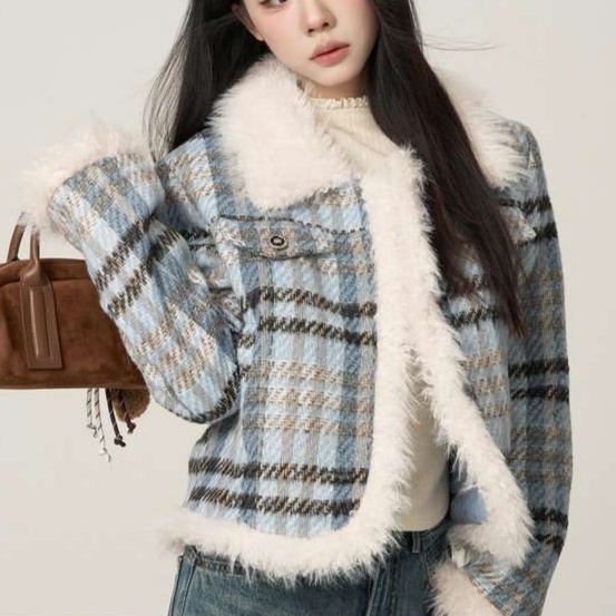 チェック柄とふわふわファーの組み合わせが冬のデート服にぴったりのショートジャケット。