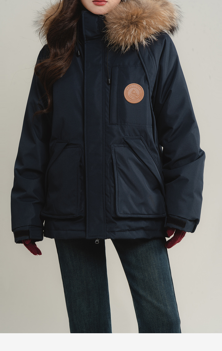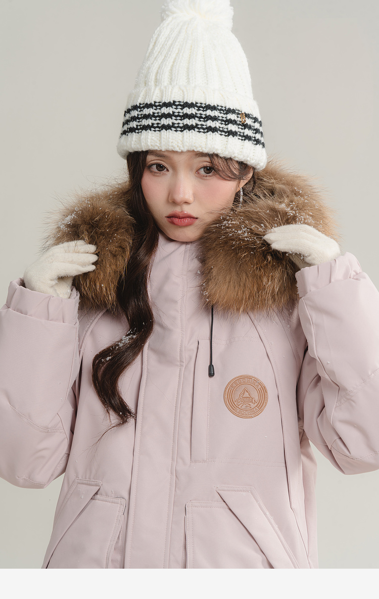 フードの天然ファーが上品な雰囲気を演出し、暖かさと華やかさを両立