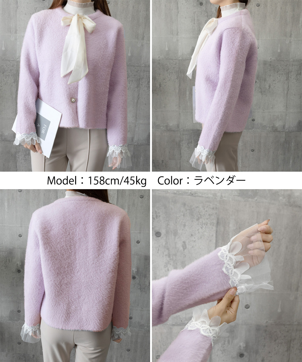パール調ボタンで上品さと華やかさをプラスし、袖口のレースが女性らしさを演出します。
