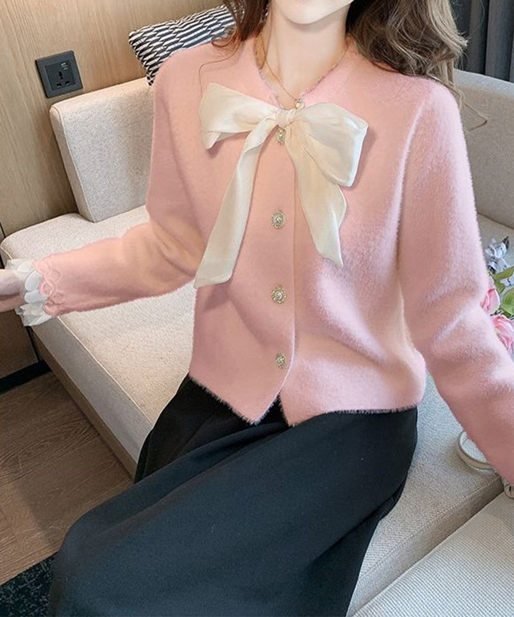 大人可愛い魅力満点のデート服にぴったりなリボンニットカーディガン。