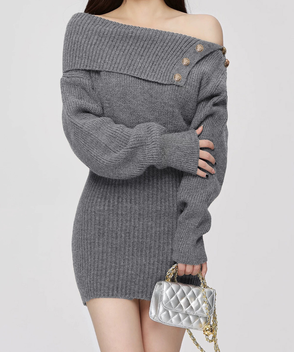 トレンドのオフショルダーに金ボタンを施した上品なニットワンピース。