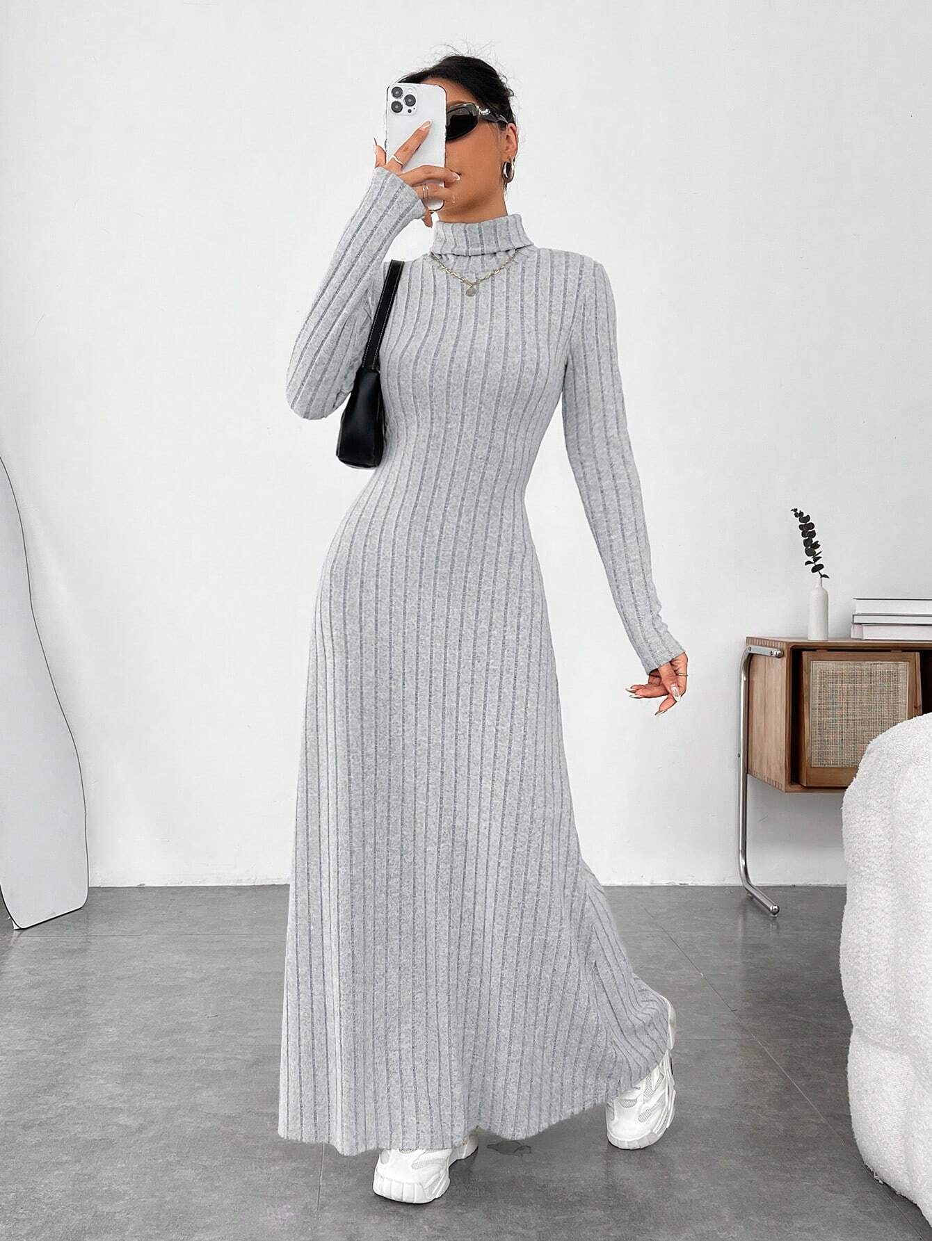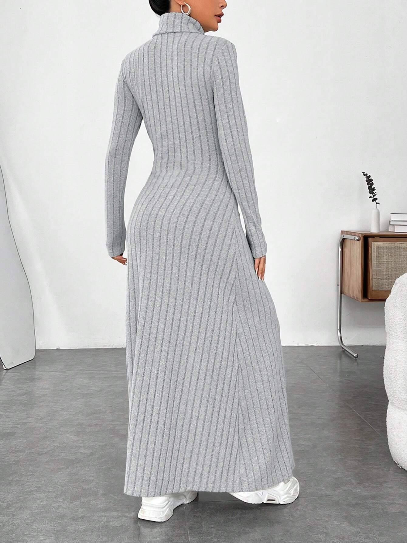 縦リブの編み地が美しく、すっきりとした縦長シルエットを演出します。タートルネックで首元を優しく包み込み、秋口の肌寒さにも対応できる一枚です。