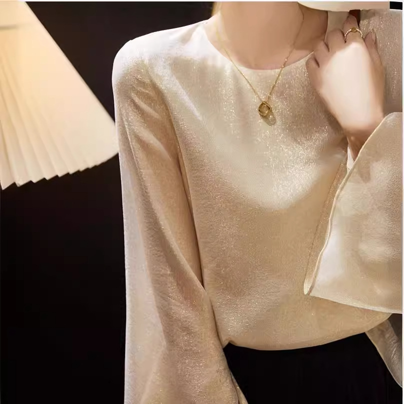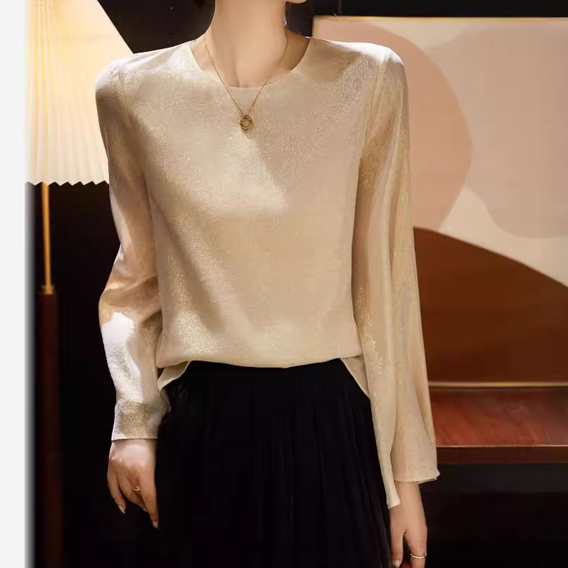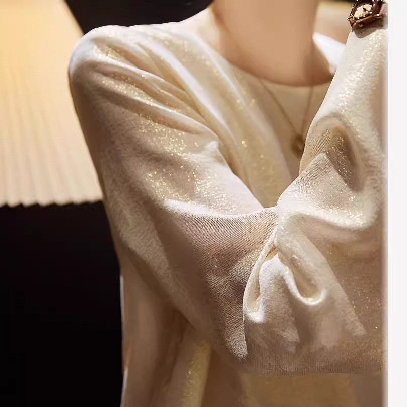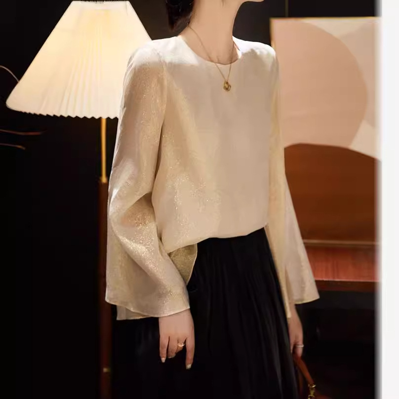 柔らかな透け感のある生地が女性らしさを引き立て、ゆったりとした長袖のシルエットが上品な印象を演出します。