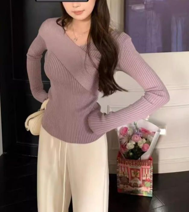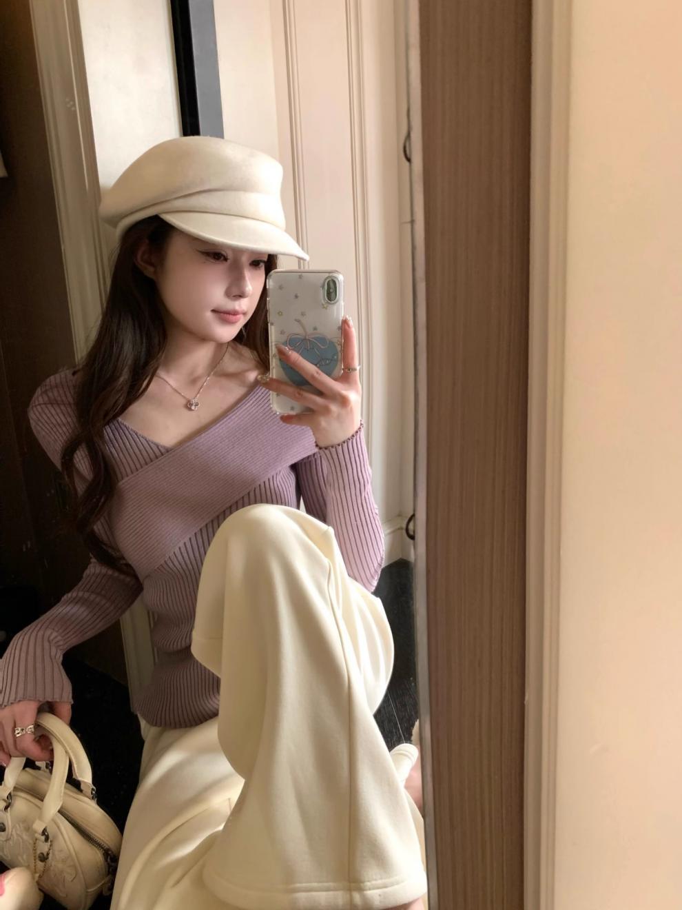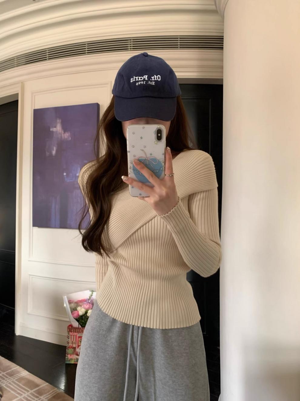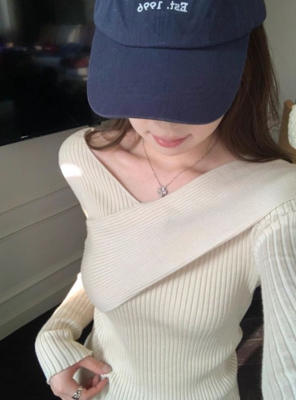 秋のデートにぴったりな女性らしさを引き立てるオフショルダーデザインのリブニットトップスです。