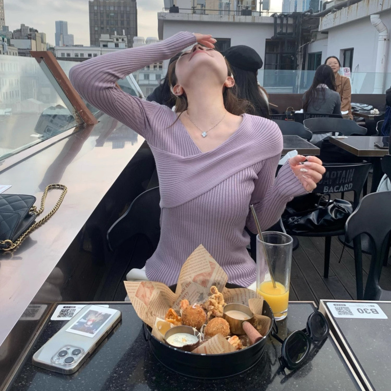 肩を美しく見せる大胆なネックラインと、体のラインに沿うリブ編みが上品な色気を演出します。