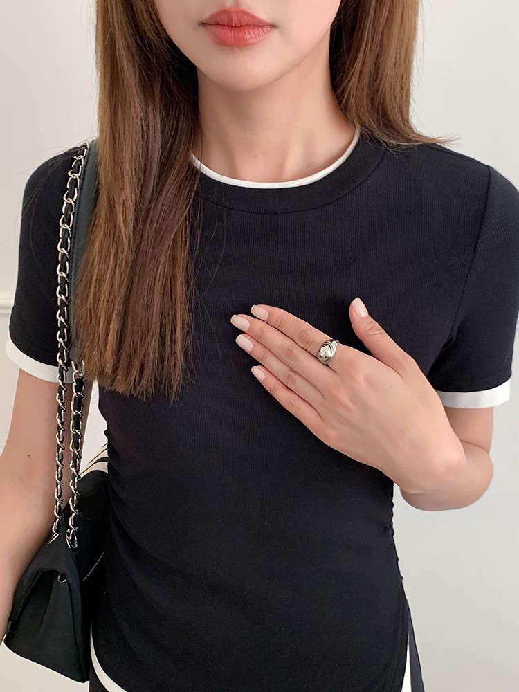 襟元と袖口の配色パイピングが上品なアクセントになったニットトップスです。