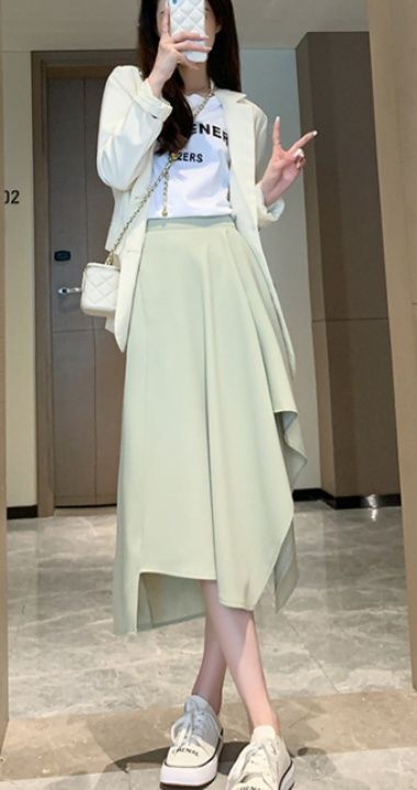 前側は膝丈で上品に、後ろ側は長めの裾が揺れる変形デザインが特徴的で、歩くたびに軽やかに動く布の流れが女性らしさを演出します。