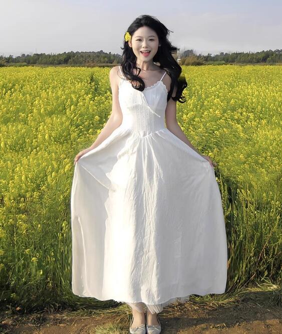 爽やかな白色が美しいロングワンピースです。 細いストラップとふんわりとしたシルエットが女性らしさを演出します。 春のデートや水族館デートにぴったりのデート服として活躍します。 上品で清楚な印象を与える一枚です。