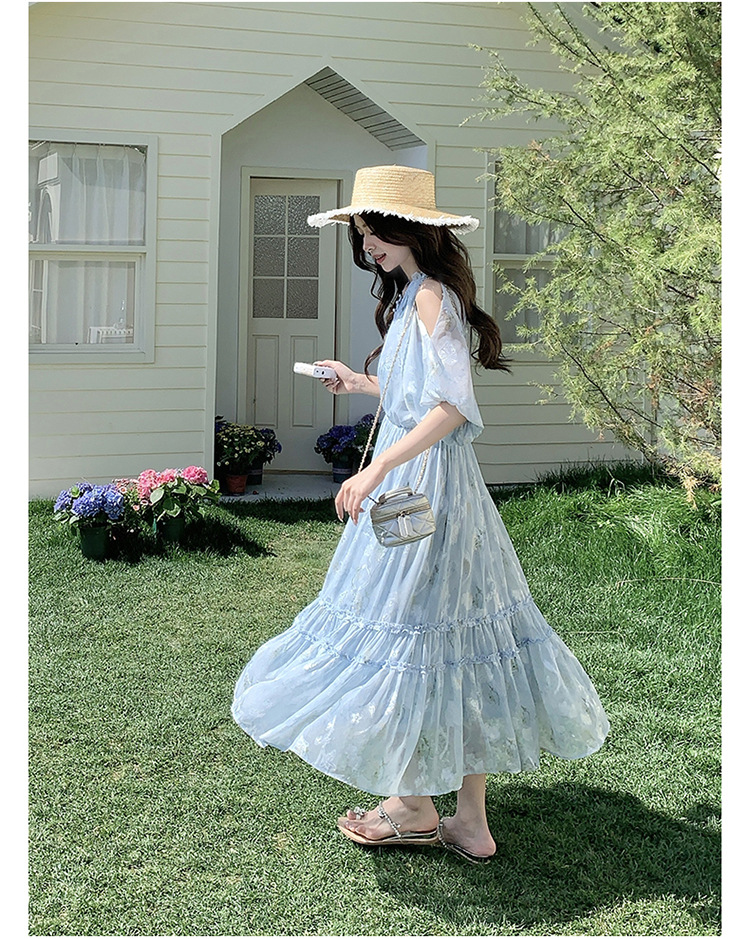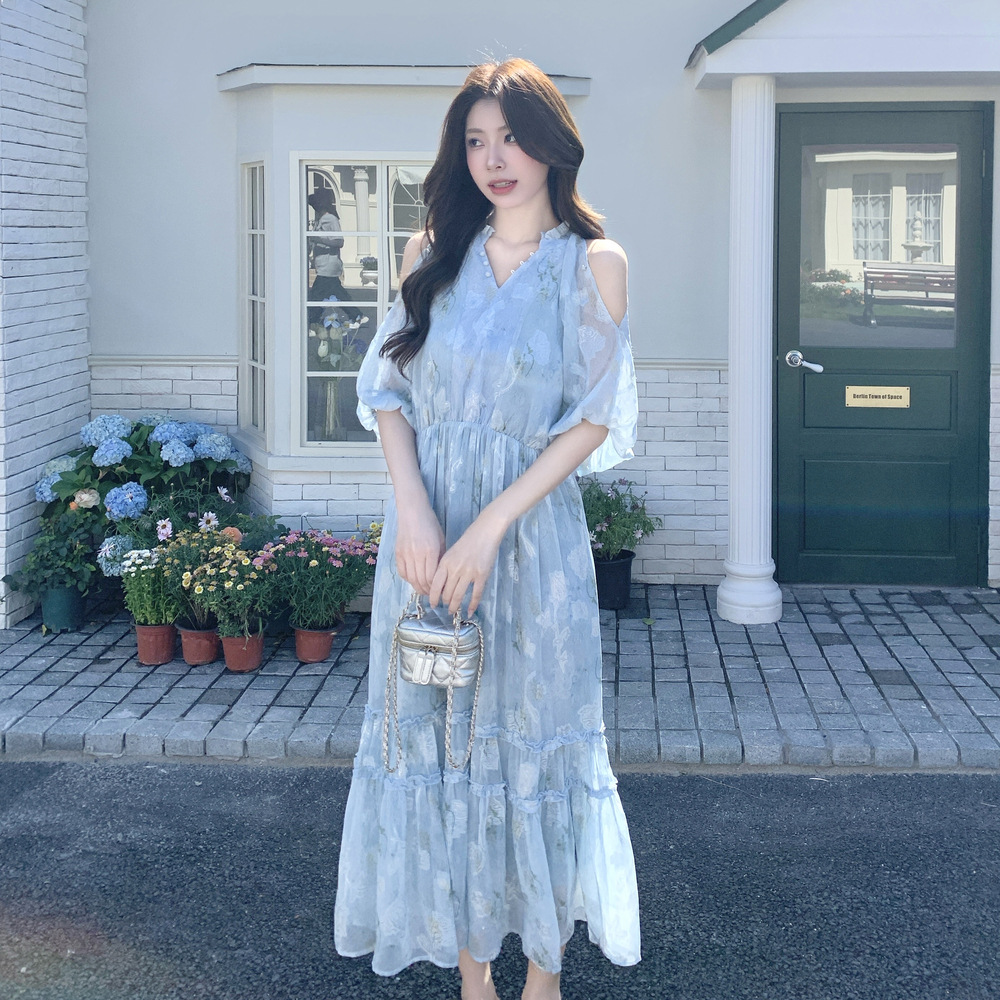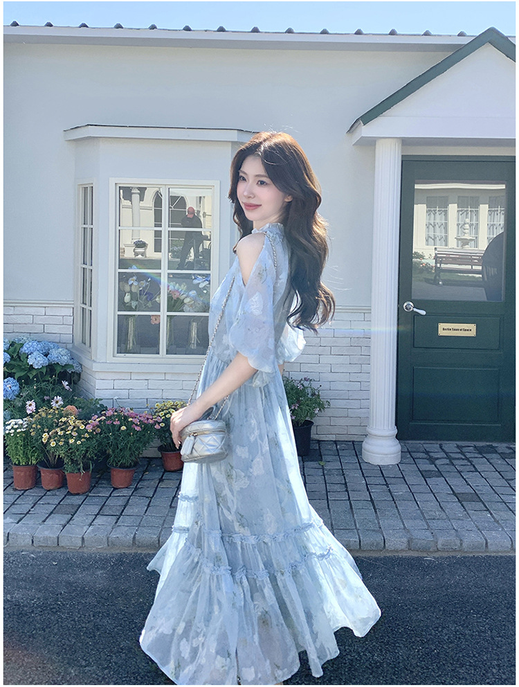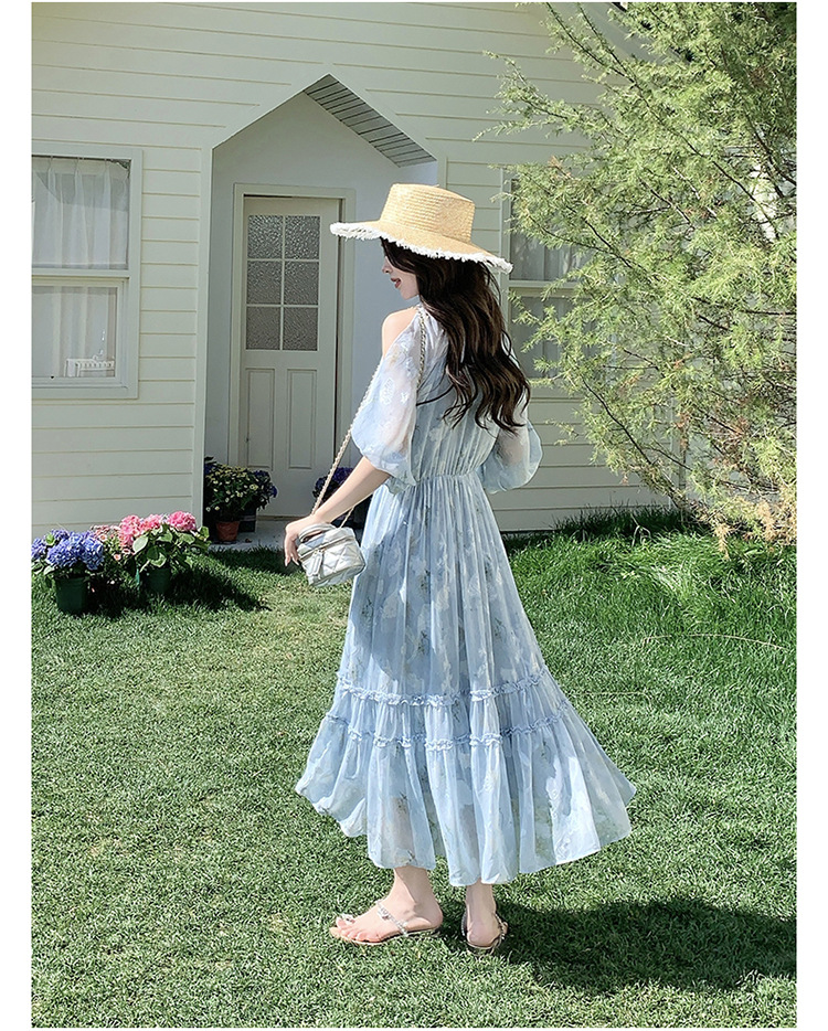 爽やかなブルーの花柄が美しいロング丈ワンピース。 コールドショルダーデザインで程よい肌見せが上品な印象を演出します。 ティアードスカートでふんわりとした女性らしいシルエットが魅力的。 夏のデート服として水族館デートや春夏のお出かけに最適です。