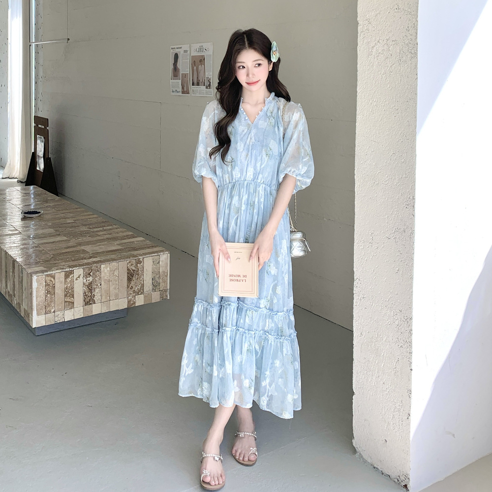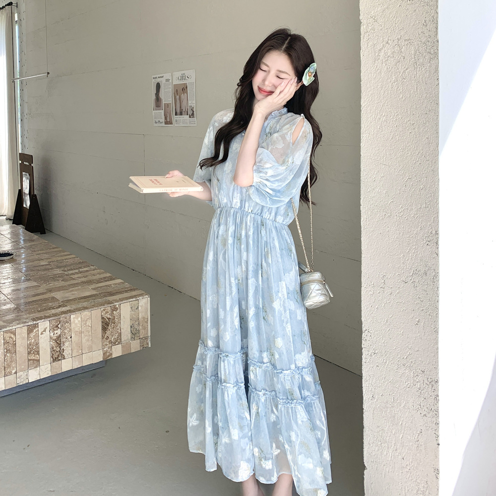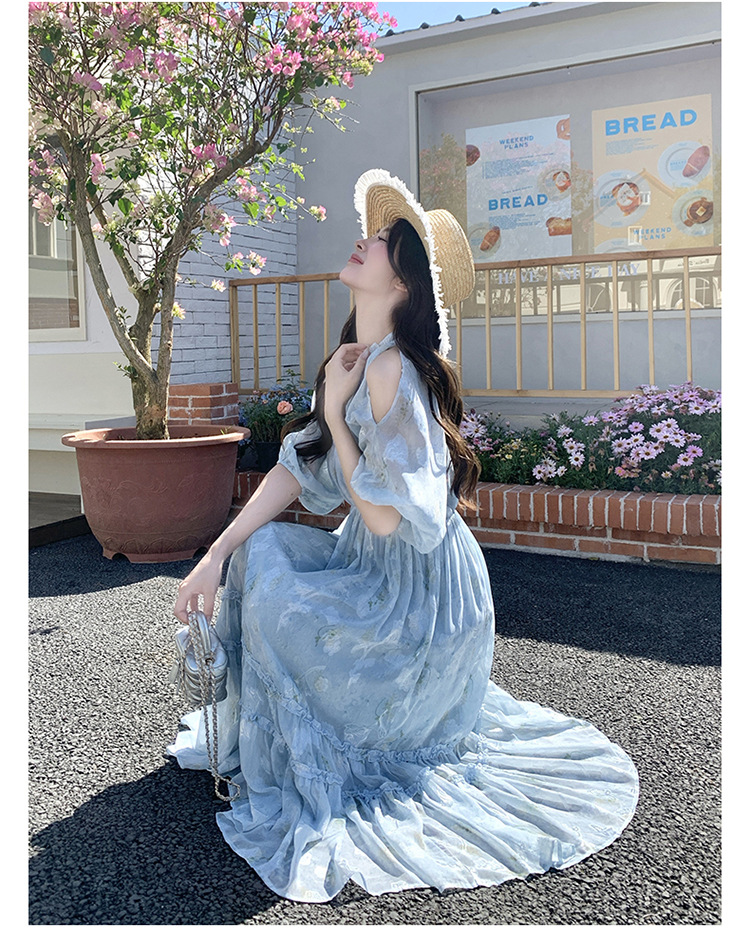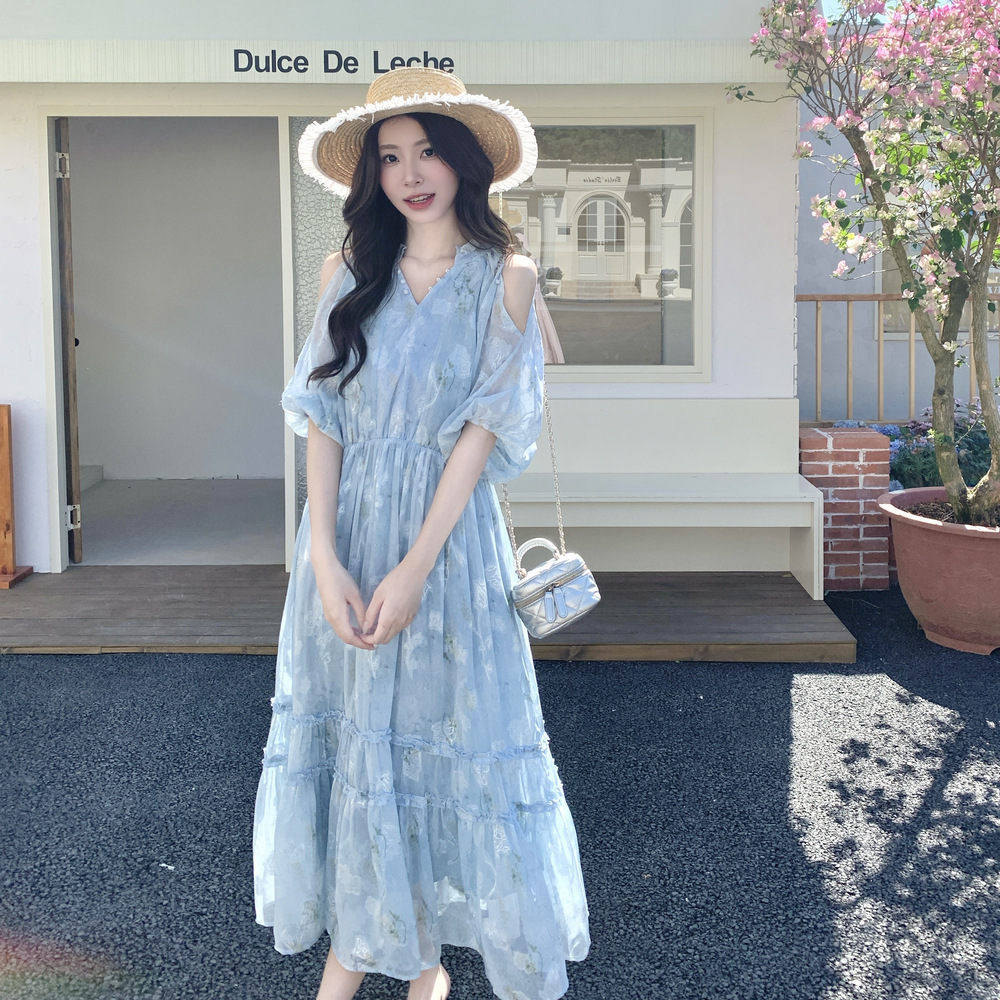 爽やかなブルーの花柄が美しいロング丈ワンピース。 コールドショルダーデザインで程よい肌見せが上品な印象を演出します。 ティアードスカートでふんわりとした女性らしいシルエットが魅力的。 夏のデート服として水族館デートや春夏のお出かけに最適です。