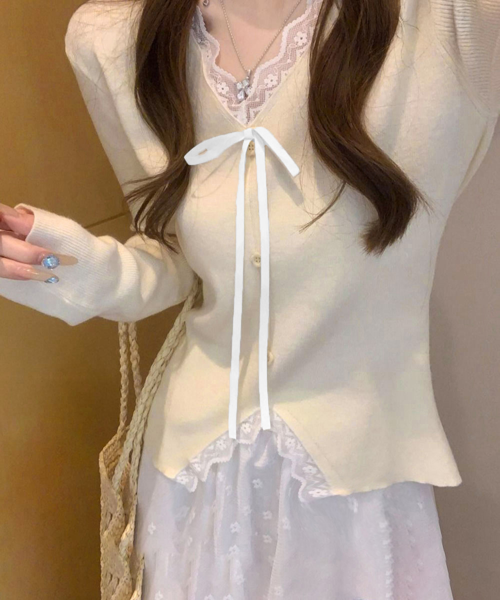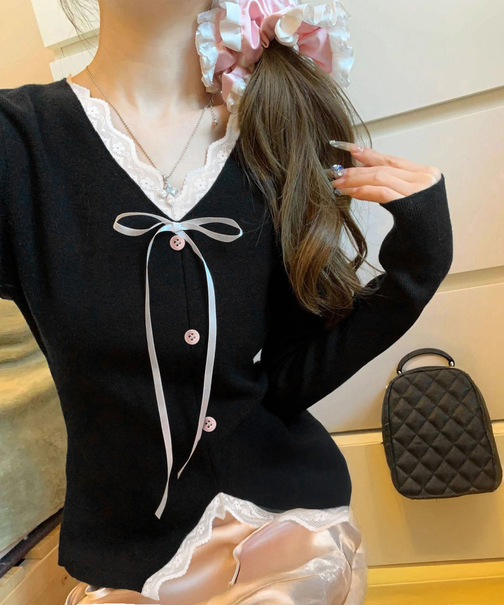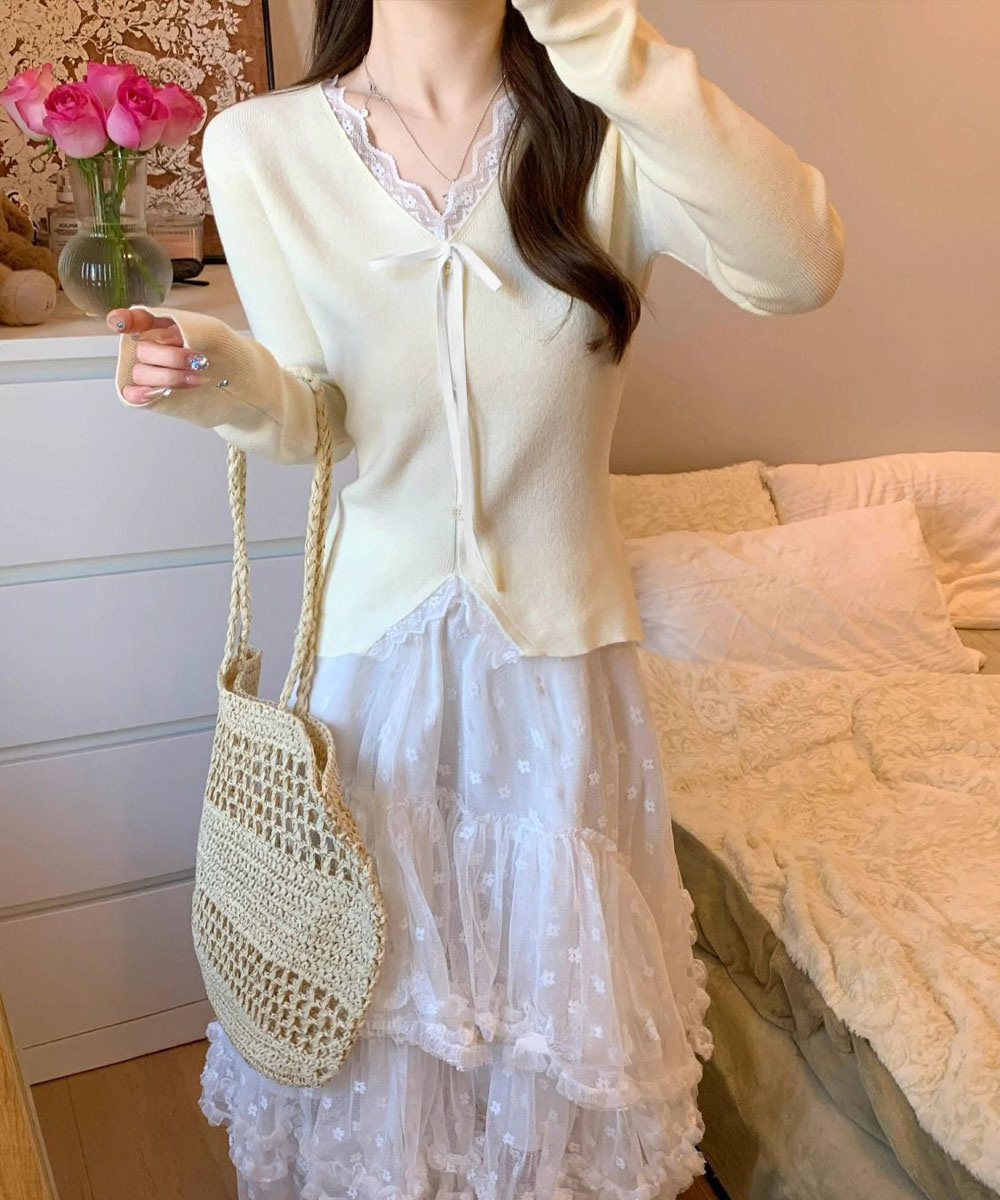 胸元のレースとリボンが上品な甘さをプラスし、デートシーンを華やかに演出。