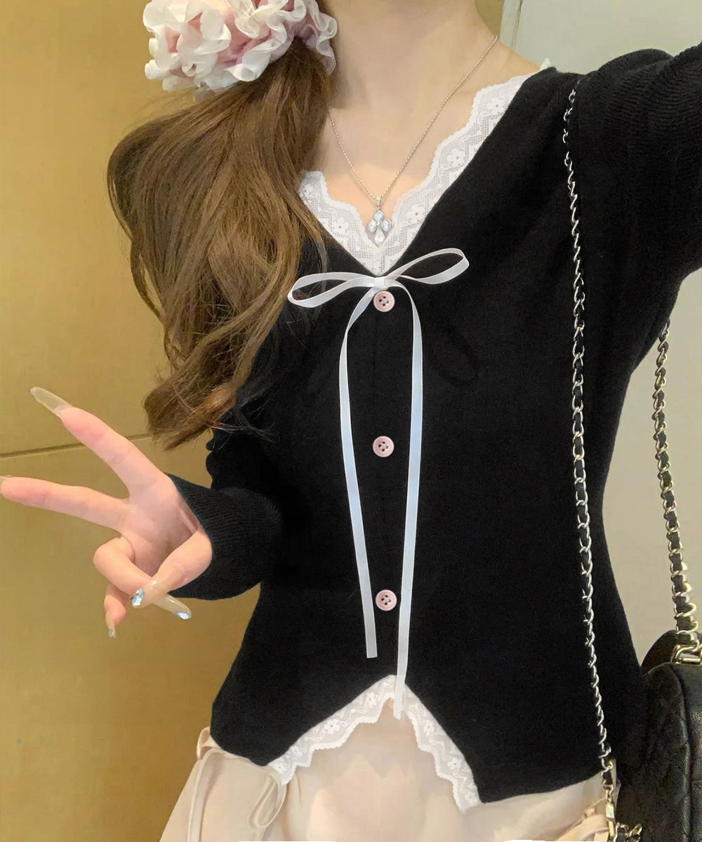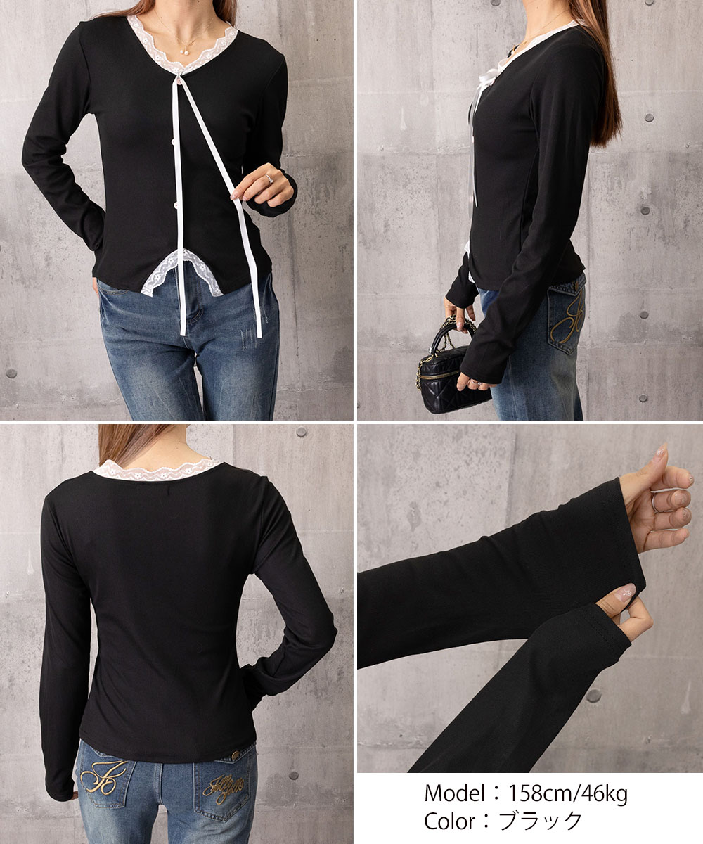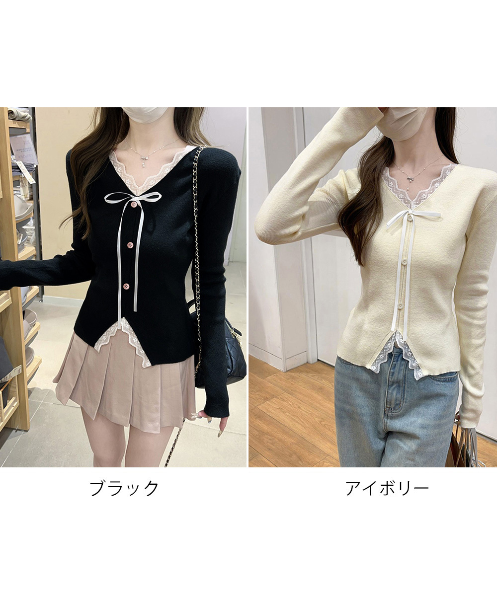レディース 大人可愛いレースカットソー春秋 お洒落ニットソー Vネックプルオーバー デートフェミニントップス大人ガーリー インナートップス春 ロングスリーブ通勤 重ね着風着やせ無地 どんなシーンでも可愛く決まる、大人ガーリーなニットトップス。 Vネックにあしらったレースとリボンが、上品な甘さをプラス。 裾スリット入りで、抜け感のあるシルエットに。 カジュアルなデニムからガーリーなスカートまで、幅広いアイテムと相性抜群。 素材:ポリエステル95%+ポリウレタン5% カラー:ブラック/アイボリー サイズ:ワンサイズ 着丈:約51cm 肩幅:約37cm 袖丈:約60cm ゆき:約78.5cm 身幅:約36cm 胸囲:約72-92cm 裏地:なし 伸縮性:あり 透け感:アイボリーのみややあり